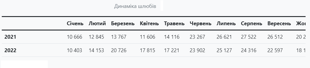 Пик "свадебного бума" пришелся на начало полномасштабного вторжения России. В марте и апреле, после начала большой войны, браков заключалось в полтора раза больше обычного. В основном лидерами по количеству вновь созданных семей были прифронтовые области. Всего за 11 месяцев 2022 было заключено почти 210 тысяч браков.