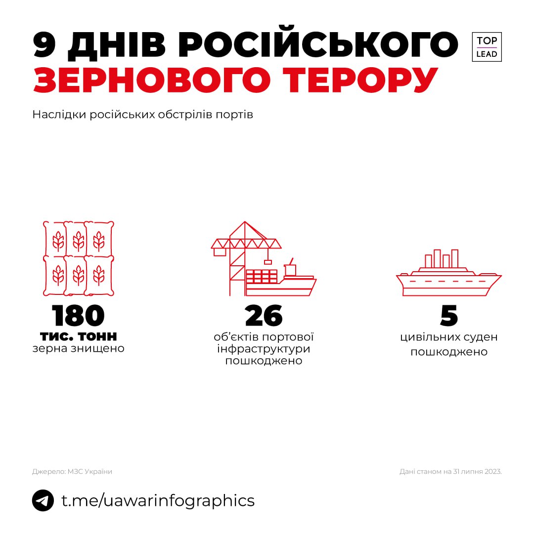 Россия за девять дней обстрелов уничтожила 180 тысяч тонн зерновых культур, 26 объектов портовой инфраструктуры и пять гражданских судов. Об этом заявило Министерство иностранных дел Украины в Х (Twitter) в понедельник, 31 июля.
