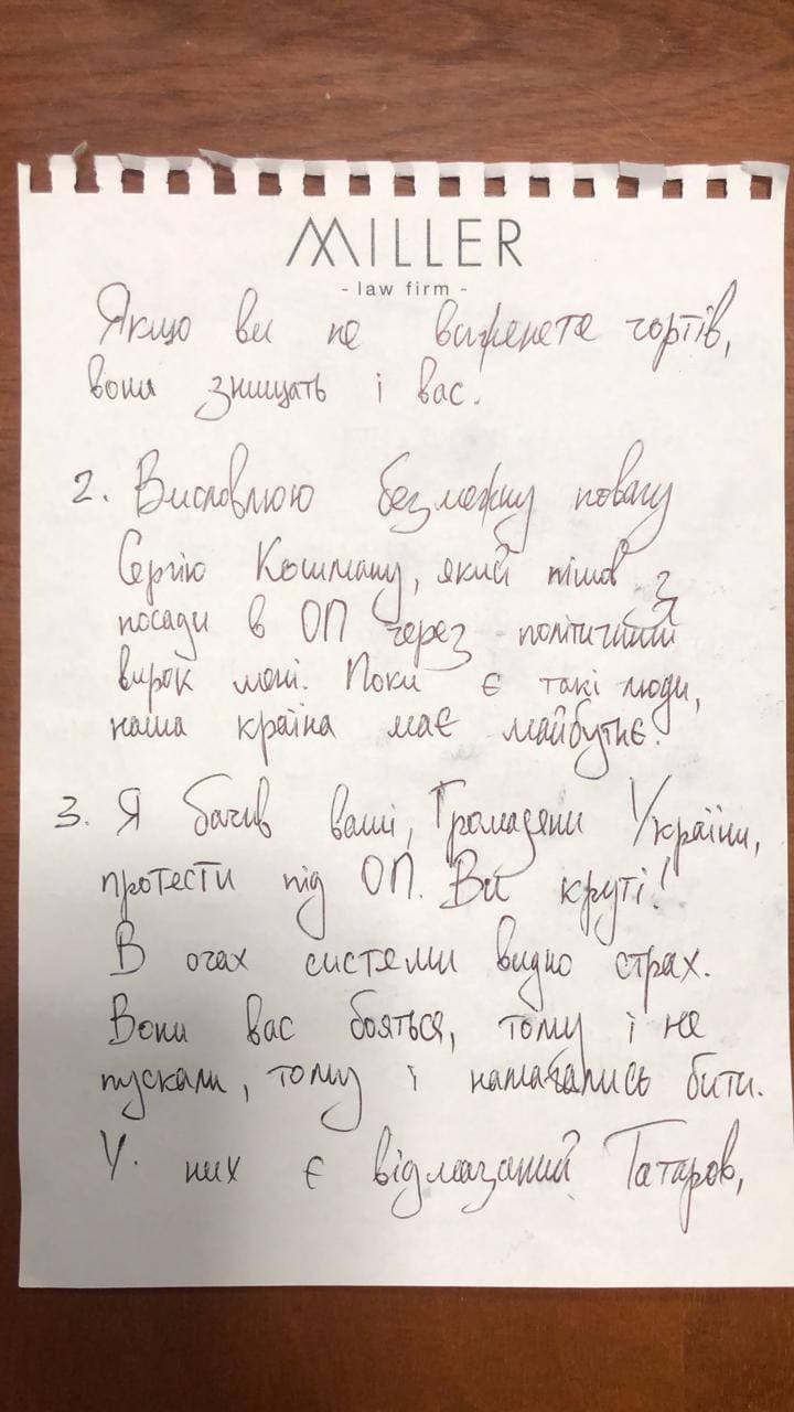 "Выражаю безграничное уважение Сергею Кошману, который ушел с поста в ОП из-за политического приговора мне. Пока есть такие люди, наша страна имеет будущее", - говорится в письме.