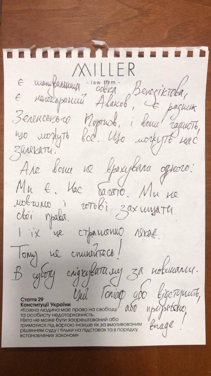 "Они вас боятся, поэтому и не пускали, поэтому и пытались бить. У них есть отмазанный Татаров, есть поклонница совка Венедиктова, есть безнаказанный Аваков, есть советник Зеленского Портнов и они думают, что могут все. Что могут нас запугать. Но они не учли одного. Мы есть. Нас много. Мы не молчим и готовы защищать свои права. И их это очень пугает. Поэтому не останавливайтесь! В субботу буду следить за новостями. Этот Голиаф или отступит, или обреченно упадет", - написал Стерненко.