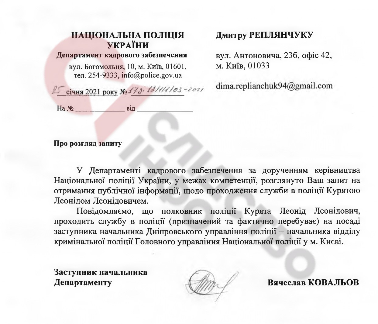 "Полковник полиции Курята Леонид Леонидович проходит службу в полиции в должности заместителя начальника Днепровского управления полиции - начальника отдела криминальной полиции Главного управления Национальной полиции в городе Киеве", - говорится в ответе Нацполиции.
