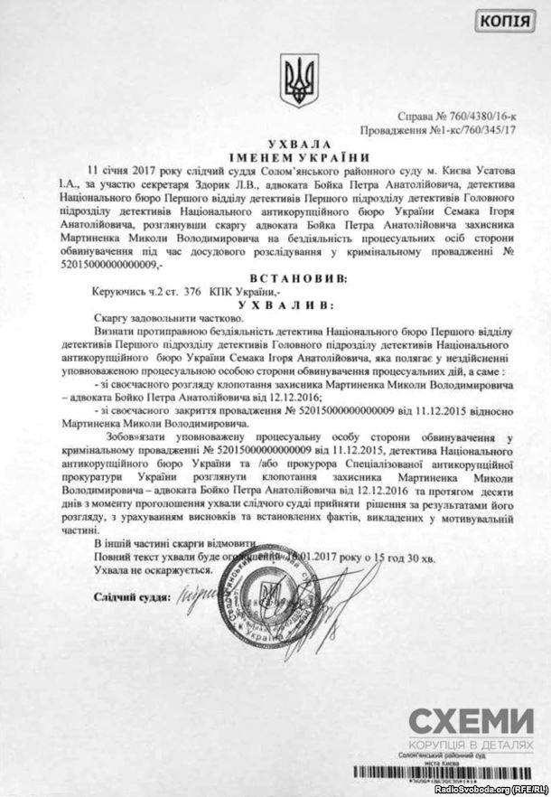 Соломенский суд Киева своим постановлением от 11 января не обязывал детективов НАБУ закрыть дело в отношении бывшего народного депутата Николая Мартыненка. Согласно тексту поставновления, которым располагают журналисты программы "Схемы", судя обязал НАБУ рассмотреть ходатайство защитника депутата и в течение 10 дней вынести решение по этому поводу, передает "Радио Свобода".