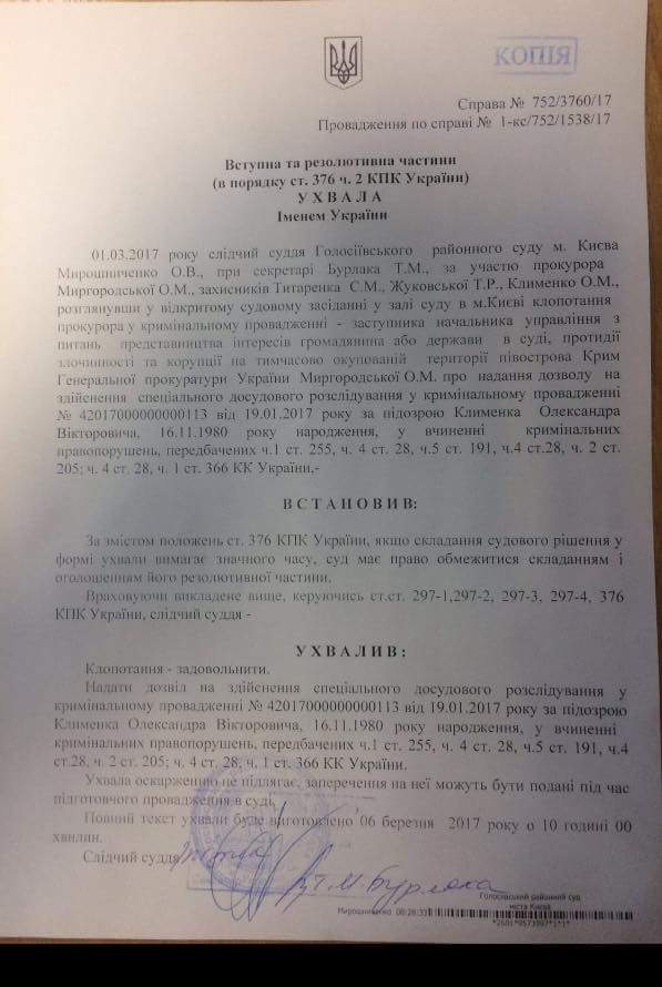 "После 17 часов "процессуальных" боев и игр адвокатов в прятки от суда, только что судья Голосеевского суда Мирошниченко, рассмотрев более 30 ходатайств защиты, предоставила разрешение на проведение специального досудебного расследования (проще – заочное расследование) относительно Клименко А.В.", – написал он в Facebook, сопроводив свою публикацию сканом постановления суда.