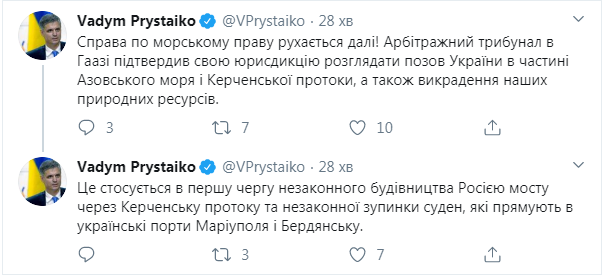 "Дело по морскому праву двигается дальше! Арбитражный трибунал в Гааге подтвердил свою юрисдикцию рассматривать иск в части Азовского моря и Керченского пролива, а также похищения наших природных ресурсов",- написал Пристайко в Twitter.