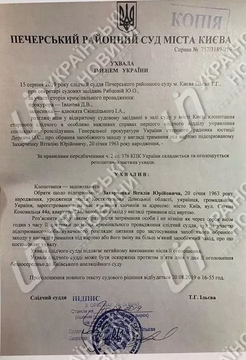Суд поддержал ходатайство прокурора Генеральной прокуратуры Украины и избрал Захарченко меру пресечения в виде содержания под стражей. Решение приняла следственный судья Татьяна Ильева, на него может быть подана апелляционная жалоба.