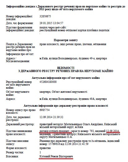 Договор купли-продажи удостоверен 12 сентября 2014 года нотариусом Могильницкой Ольгой Андреевной. Лицо с такими ФИО является уроженкой Донецка. В Киеве Могильницкая была прописана в том же общежитии, что и Кутовой.