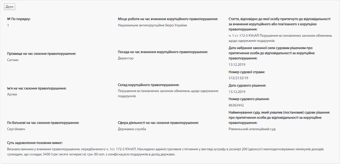 В Едином реестре коррупционеров указано, что Сытника привлекли к ответственности по ч. 1 ст. 172-5 Куоап Нарушение установленных законом ограничений относительно получения подарков. Также в реестре указаны дата вступления в законную силу приговора, номер судебного дела и номер судебного решения, а также суд, который рассматривал дело.