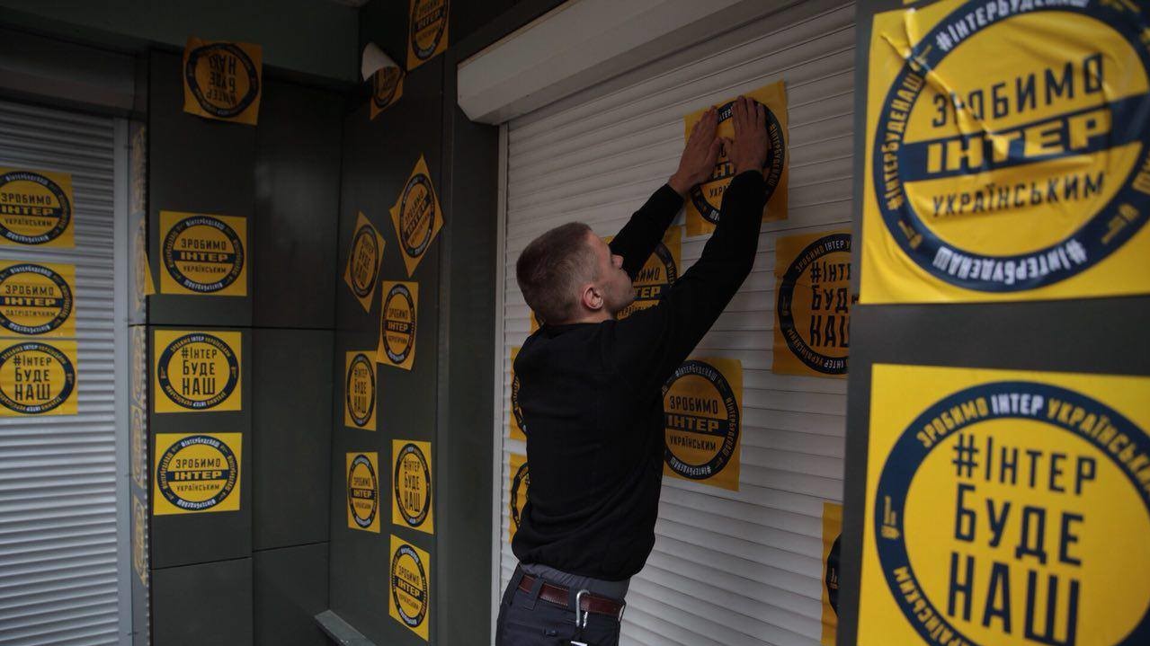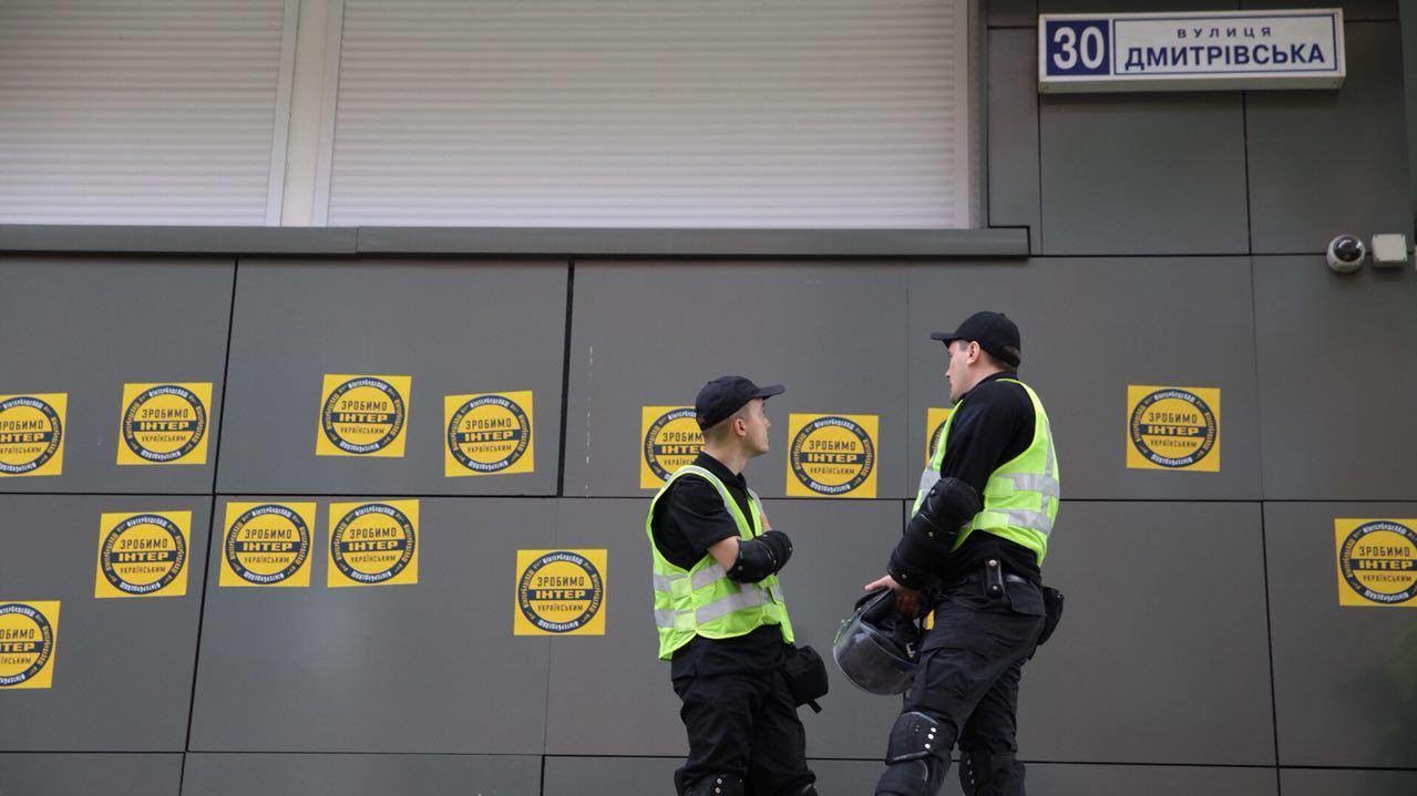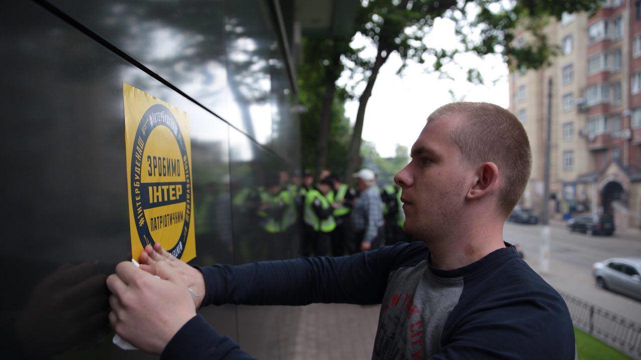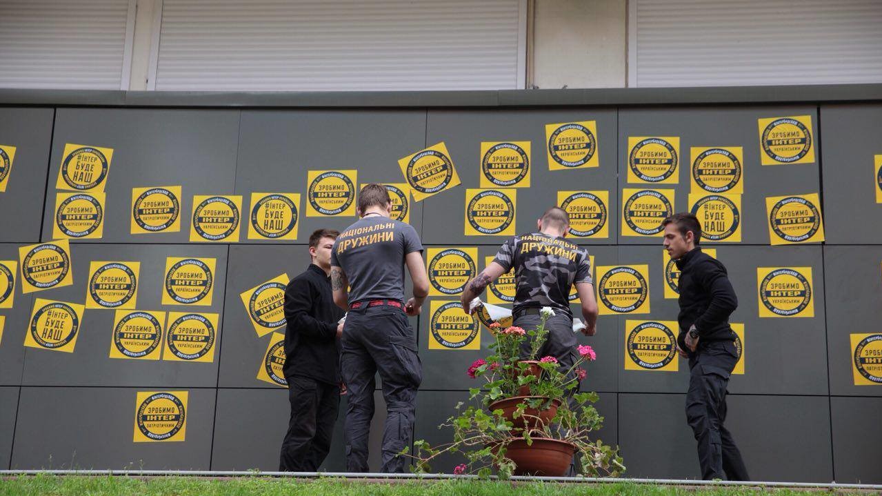 На видеозаписи видно, что активисты обклеили здание телеканала желтыми наклейками с надписями "Интер" будет наш" и "Сделаем "Интер" украинским". Они также зажгли на козырьке здания дымовую шашку и перекрасили синюю вывеску телеканала в цвета украинского флага.