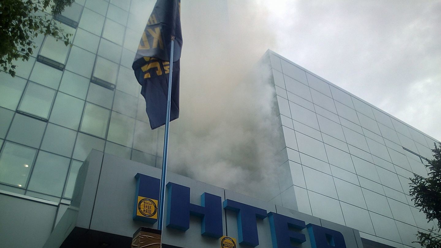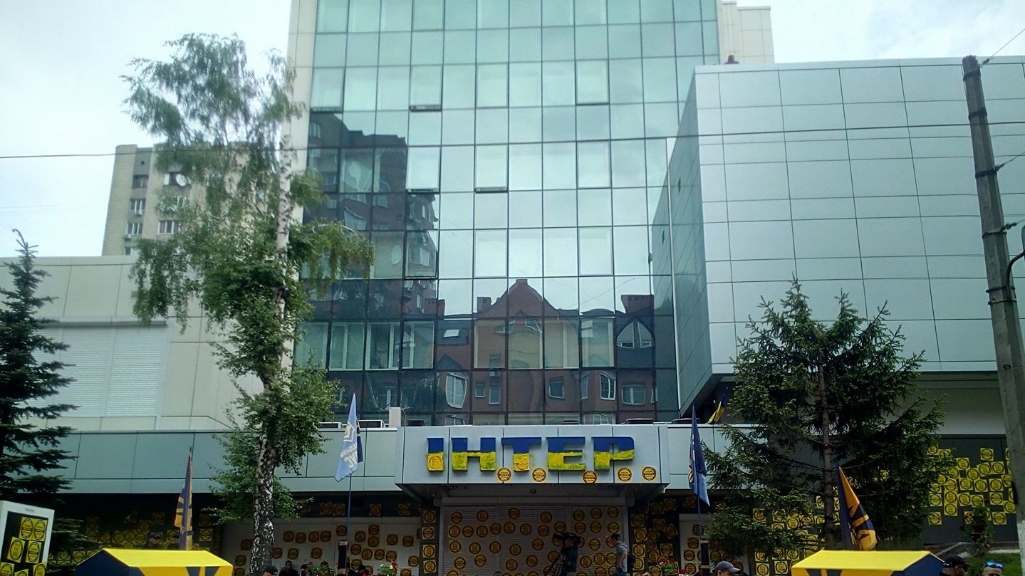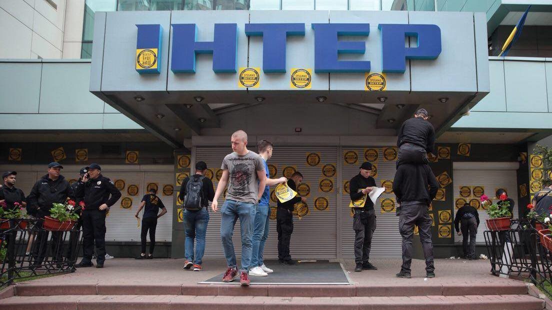 На видеозаписи видно, что активисты обклеили здание телеканала желтыми наклейками с надписями "Интер" будет наш" и "Сделаем "Интер" украинским". Они также зажгли на козырьке здания дымовую шашку и перекрасили синюю вывеску телеканала в цвета украинского флага.