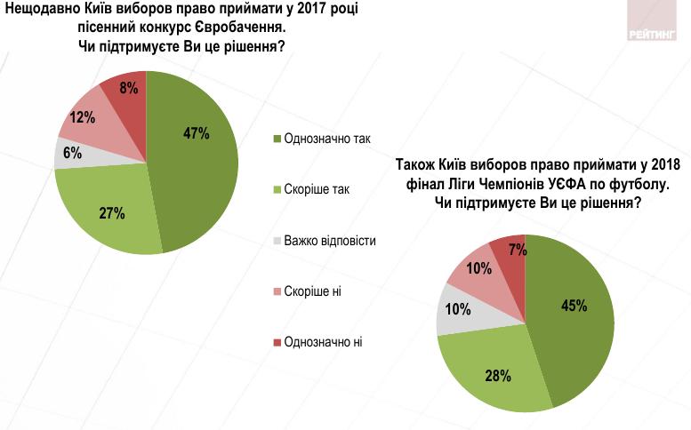 Три четверти жителей столицы (74%) поддерживают право Киева принимать в 2017 году песенный конкурс Евровидение, свидетельствуют данные опроса Социологической группы "Рейтинг".