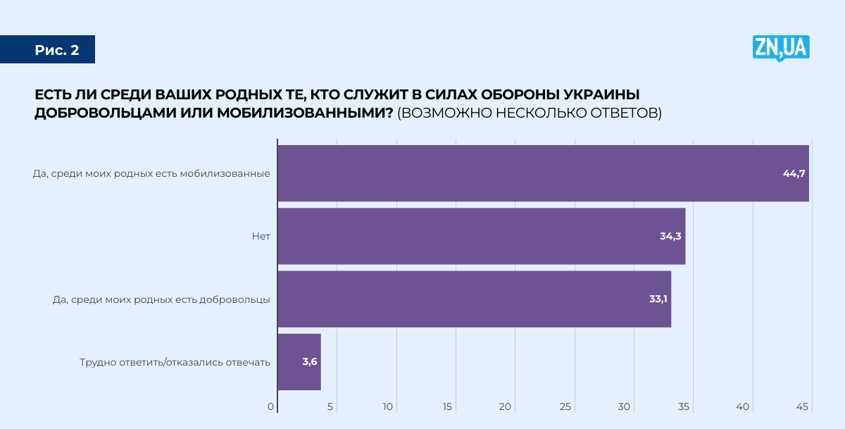 Также у украинцев спросили, «есть ли среди ваших родных те, кто служит в Силах обороны Украины добровольцами или мобилизованными?»