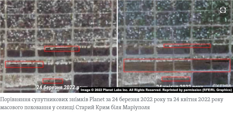Спутниковая съемка обнаружила очередное, уже третье, массовое захоронение под Мариуполем. На этот раз в оккупированном российскими войсками поселке Старый Крым в 5 км от уничтоженного Россией города. Длина траншей за месяц выросла на 200 метров, сообщают «Схемы».