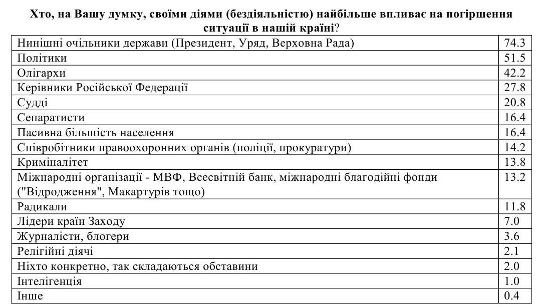 Главную ответственность за рост напряженности украинцы возлагают на власть. 74% считают, что больше всего своими действиями (бездействием) влияют на ухудшение ситуации в стране нынешние руководители государства (президент, правительство, Верховная Рада), 52% склонны винить в этом политиков, 42% – олигархов. Около 30% связывают рост напряженности с деятельностью руководства Российской Федерации.