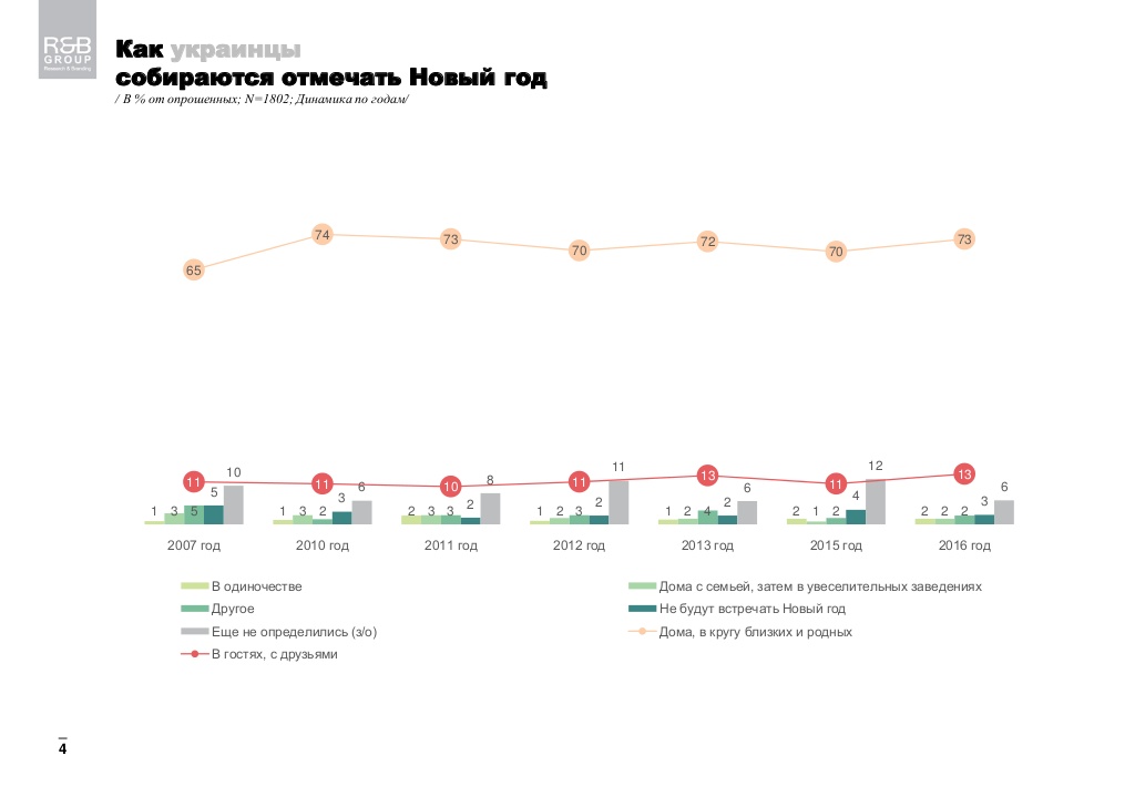 Второй по популярности среди украинцев (13%) способ встречи Нового года состоит в том, чтобы отпраздновать его в гостях у своих друзей и знакомых. Именно так в нынешнем году собирается поступить один из каждых восьми наших соотечественников (13%). Эта цифра также устойчива на протяжении ряда последних лет.