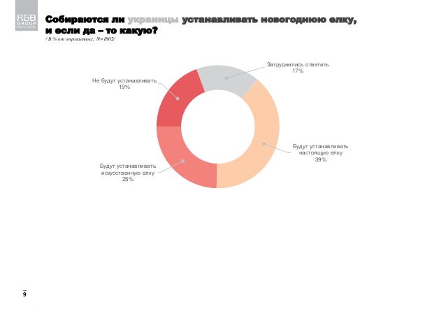 По результатам опроса, новогоднюю елку в нынешнем году собирается установить примерно 2/3 взрослых украинцев (64%). При этом большинство из них намерено поставить настоящую елку (39%), а меньшинство - искусственную (25%). Примерно каждый пятый украинец (19%) в нынешнем году определенно не будет устанавливать елку. Остальные же (17%) пока не определились в данном вопросе.
