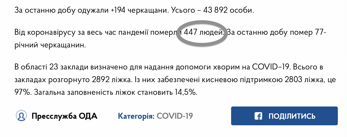 На сайте Черкасской областной государственной администрации говорится, что за все время коронавирусной инфекции в регионе от осложнений болезни умерло 447 человек.