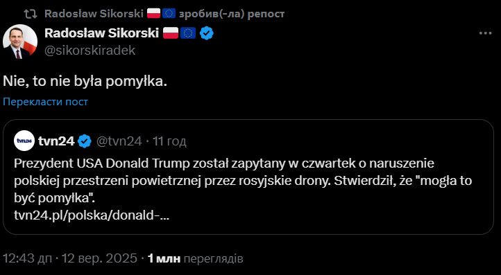 — Radek Sikorski (@radeksikorski) 12 сентября 2025 года