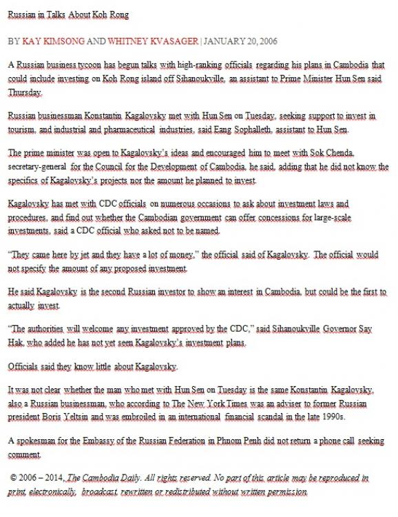 Он также добавляет, что в этом деле замешан российский бизнесмен Константин Кагаловский, который является крупным инвестором в Камбодже и находится в дружеских отношениях с премьером и вице-премьерами Камбоджи.