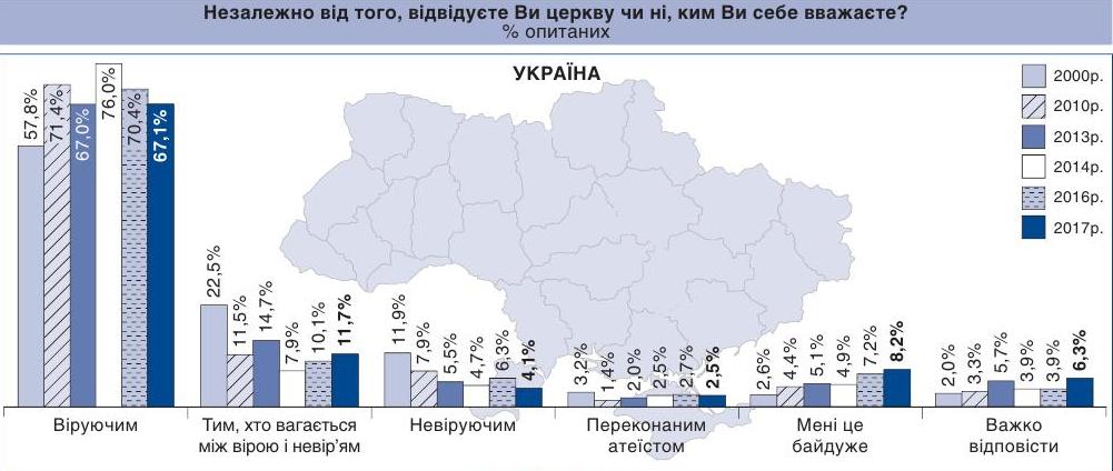 Напомним, что по данным опроса Центра Разумкова, две трети граждан (68,2%) считают себя православными, к римско-католической церкви принадлежат 1,0% украинцев, r Украинской греко-католической – 7,8%, протестантами себя считают 0,8%, исповедуют иудаизм 1,3%, ислам – 0,2%, буддизм - 0,1%, индуизм – 0,1%, язычество – около 0%, просто христианами себя считают 7,0%, другие религии исповедуют 0,4%, не относят себя ни к каким религиозным вероисповеданиям – 12,6%, отказались отвечать 0,6% респондентов.