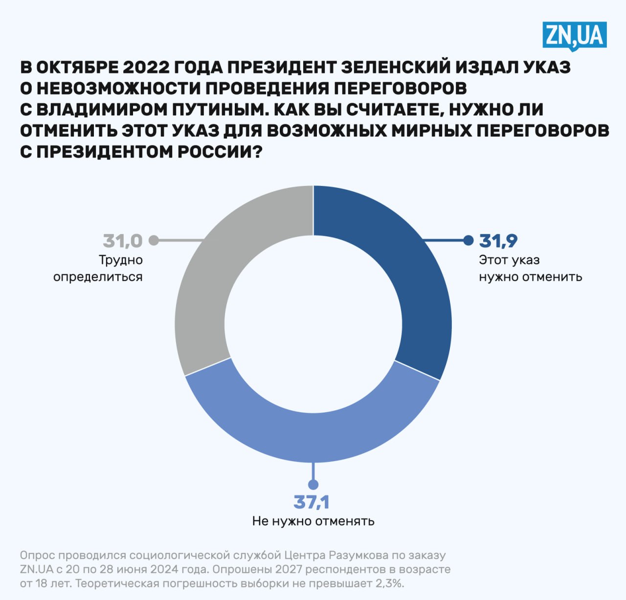 В рамках социологического исследования, проведенного по заказу ZN.UA Центром Разумкова, украинцам задали вопрос: «В октябре 2022 года президент Зеленский издал указ о невозможности проведения переговоров с Владимиром Путиным. Как вы думаете, нужно ли отменить этот указ для возможных мирных переговоров с президентом России?».