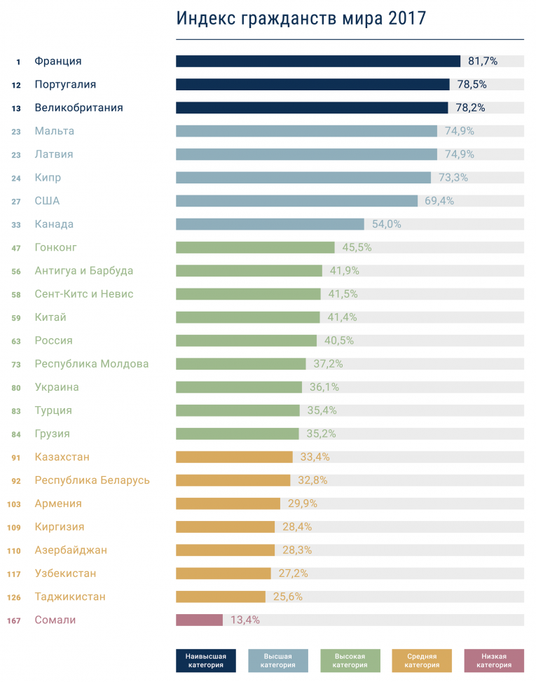 В 2017 году, впервые за последние пять лет, первое место получила Франция (81,7%). Лидер прошлогодних рейтингов – Германия – заняла второе место (81,6%). В целом первая десятка Индекса остается почти прежней: Исландия, Дания, Нидерланды, Норвегия, Швеция, Финляндия, Италия, Ирландия, Швейцария, Австрия. В обновленном рейтинге Ирландии удалось заменить в десятке лидеров Испанию, которая переместилась на 11-е место. Наименее ценные гражданства имеют Афганистан (14,6%) и Сомали (13,4%).