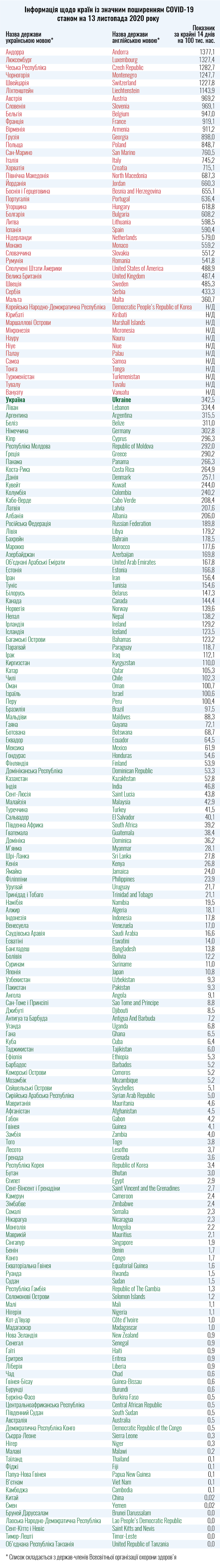 Украина входит в "зеленую зону", с показателем заболеваемости 342,5 активных случаев на 100 тыс. населения. По состоянию на 13 ноября в Украине лабораторно подтверждено 11 787 новых случаев заболевания COVID-19. За все время пандемии в Украине заболели 512 652 человека.