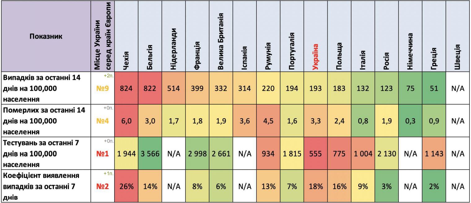 Также Украина стала девятой среди европейских стран по количеству новых случаев за две недели на 100 тысяч населения - 193.