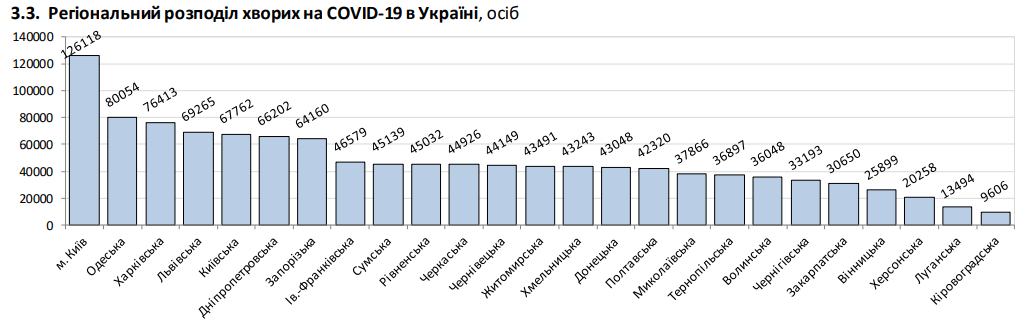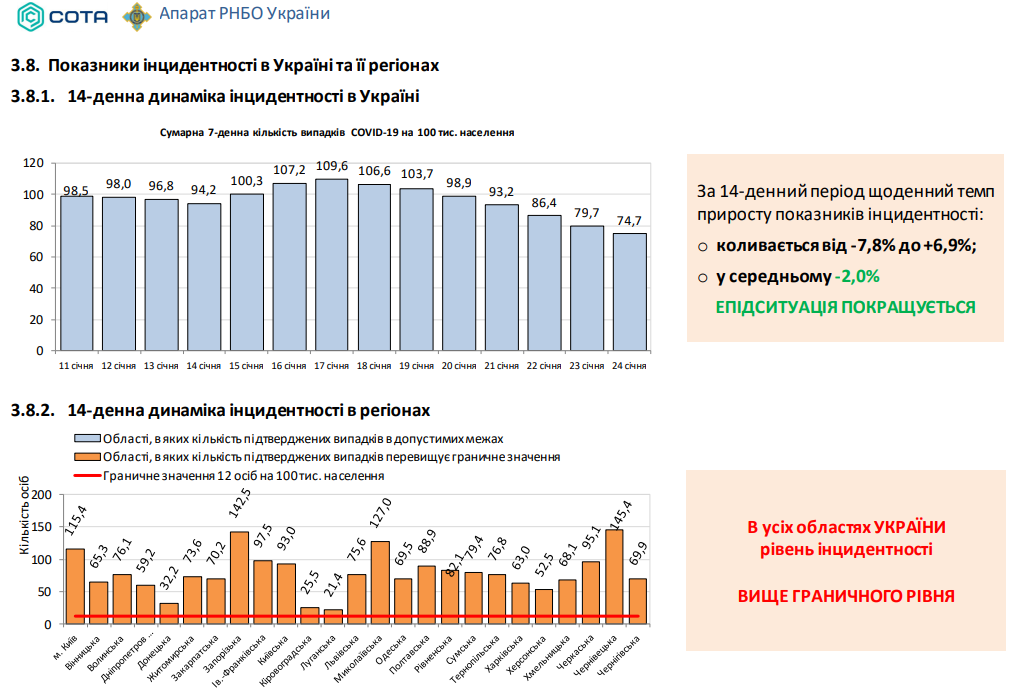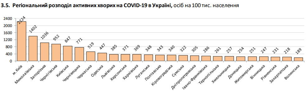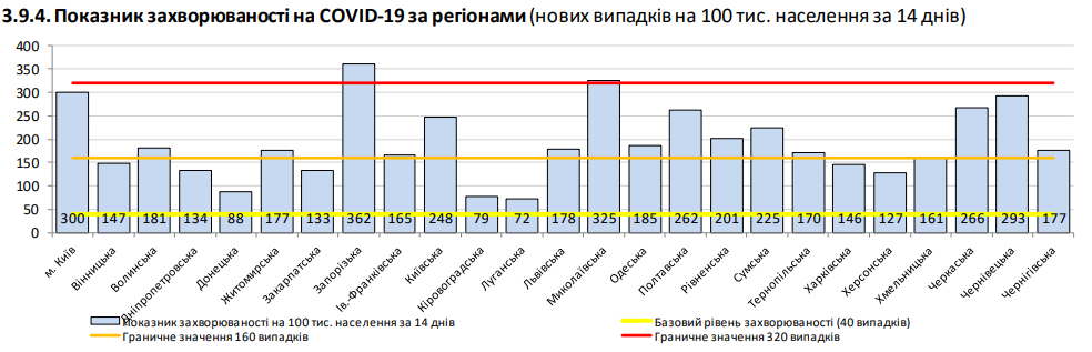 Уровень заболеваемости превышает предельно допустимую отметку в 320 случаев на 100 тысяч населения в Запорожской и Николаевской областях, приближается - в Черкасской и Черновицкой, а также в Киеве. Базовый уровень заболеваемости (40 человек на 100 тысяч) превышен во всех областях страны, предельный - более чем в половине регионов.