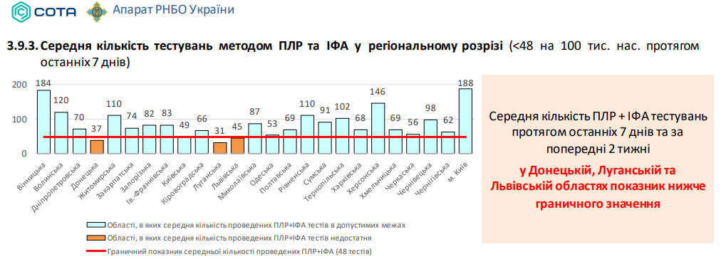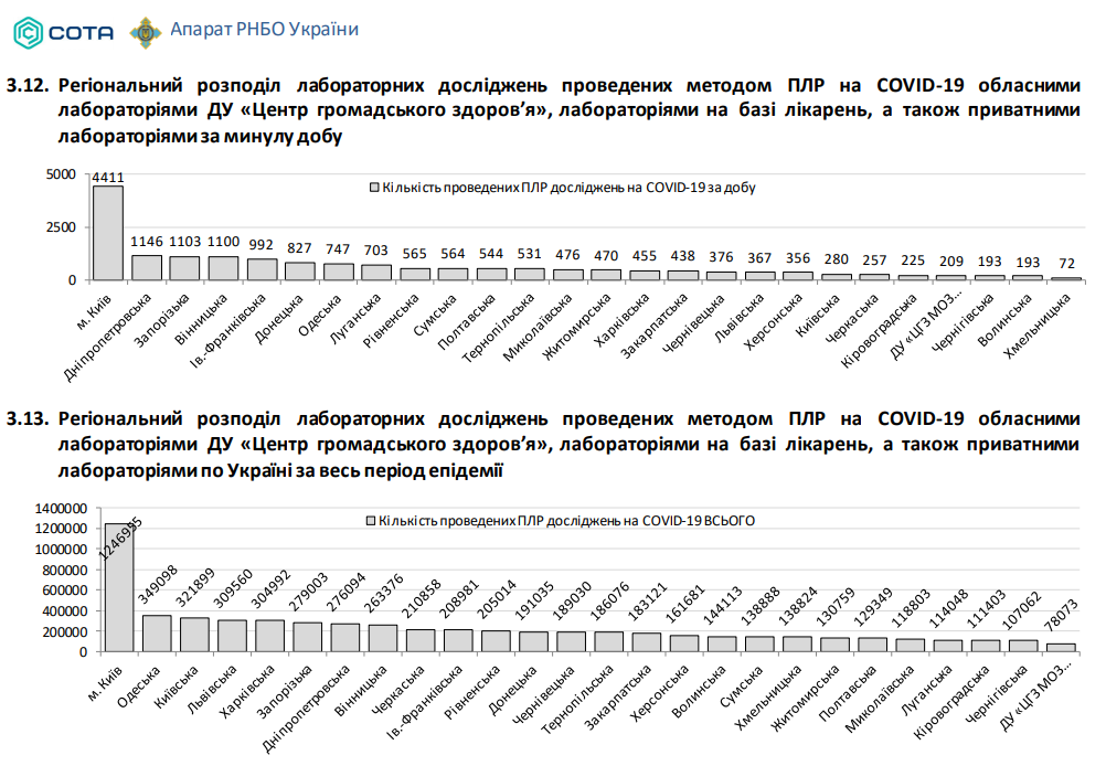 В среднем по Украине делают 146 340 тестов на 1 млн человек, речь идет как о тестах ПЦР, так и о тестировании методом ИФА. Больше всего - в Киеве, Одессе, Львове и Харькове. В то же время в эпидемически-сложных Николаевской, Черкасской и Черновицкой областях охват населения тестированием остается низким.