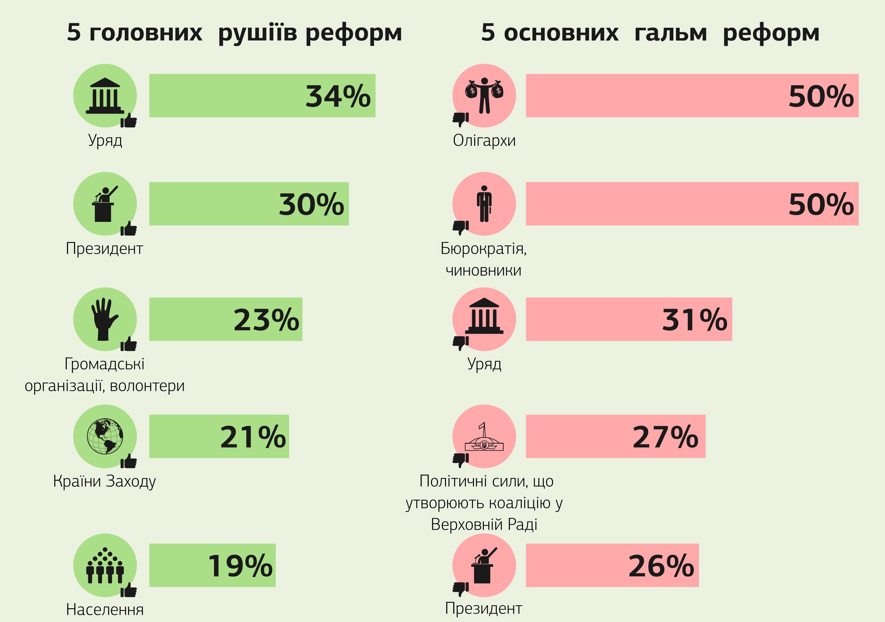 Главными двигателями реформ население считает правительство (33,5%), президента (29,5%), общественные организации, волонтеров (23%), страны Запада (21%), население (19%). По сравнению с июлем 2015 года почти вдвое возросли надежды на страны Запада как двигателей украинских реформ.