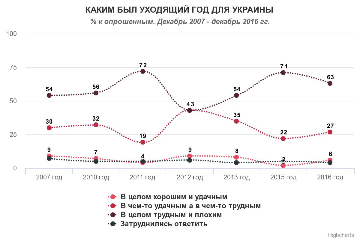 Как отмечают социологи, 2016 год в оценках украинцев стал лучше предыдущего, 2015 года: число позитивных оценок увеличилось почти вдвое, а негативных – сократилось на 9%.