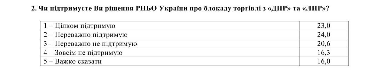 Cамая dысокая поддержка блокады – на Западе Украины (66%), несколько ниже – в Центре (47%). Примечательно, что наименьшее количество сторонников таких действий на Юге – 30%, тогда как на Востоке она составляет 38%.