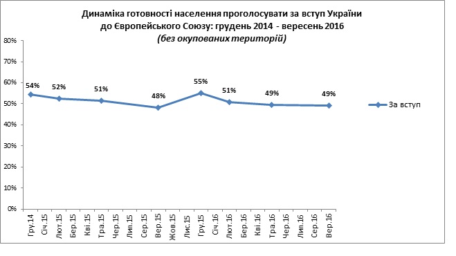 В сентябре 2016 года, за вступление Украины в ЕС были готовы проголосовать около половины жителей страны.