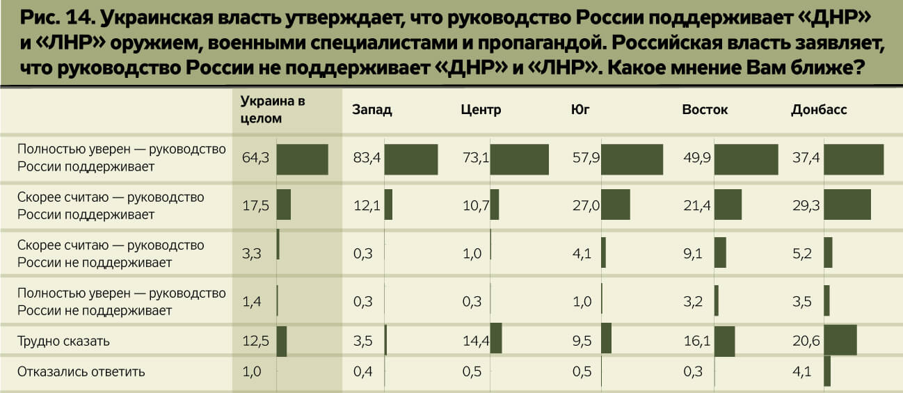 Респондентам задали вопрос, считают ли они, что руководство Российской Федерации оружием, военными специалистами и пропагандой поддерживает так называемые "ДНР" и "ЛНР". Согласно результатам две трети граждан Украины полностью уверены в поддержке "народных республик" Россией. Количество респондентов, поддерживающих это мнение, смягчается с Запада на Восток: Запад (83,4%), Центр (73,1%), Юг (57,9%), Восток (49,9%), Донбасс (37,4%). Почти одна пятая украинцев "скорее считает, что руководство России поддерживает". Наибольший показатель наблюдается в Донбассе – 29,3%. При этом, всего 1,4% граждан считают, что Россия никоим образом не поддерживает террористические "ДНР" и "ЛНР".