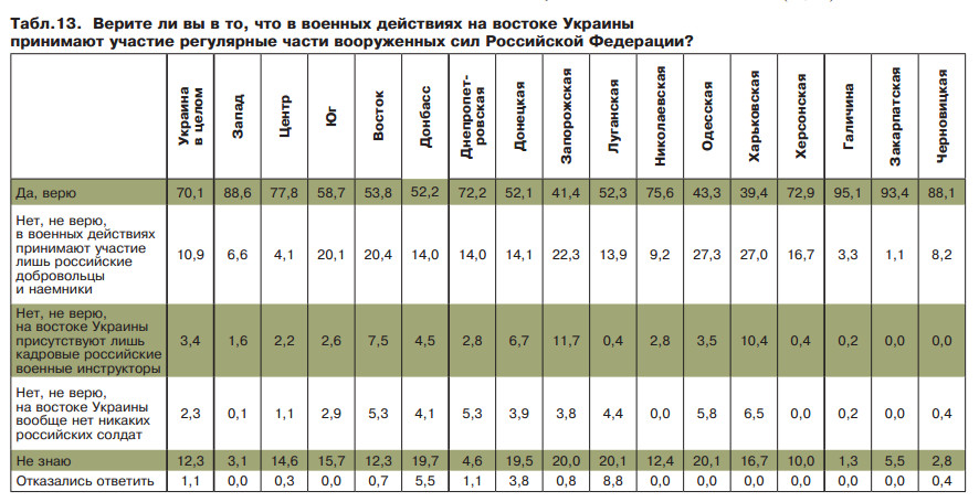 Почти три четверти (70,1%) украинцев верят в участие регулярных частей Вооруженных Сил РФ в военных действиях в оккупированном Донбассе. Показатель все так же снижается по региональному принципу: наибольший - на Западе (88,6%), наименьший – на самом Донбассе (52,2%). Также 10,9% убеждены в наличии на Востоке российских добровольцев и наемников, 3,4% - кадровых военных российских инструкторов. Отрицают наличие российских солдат всего 2,3% населения.