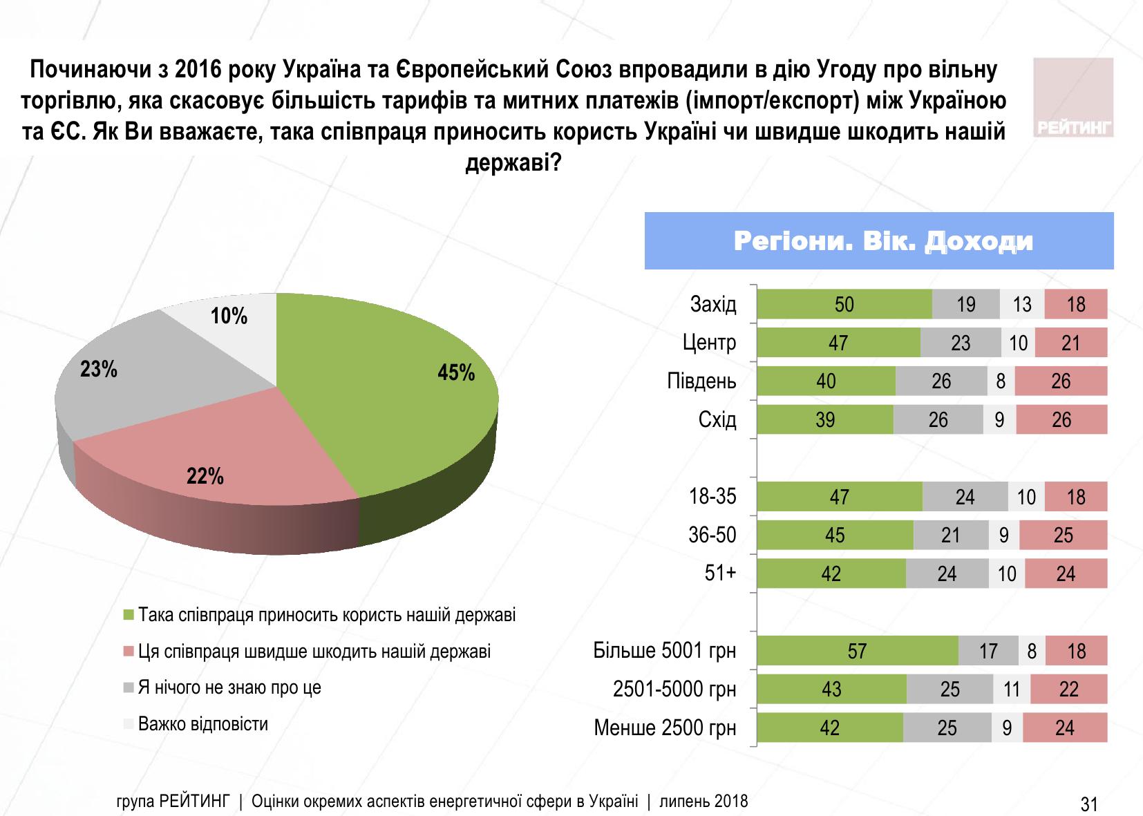Оценивая выгодность сотрудничества Украины с различными странами, относительное большинство опрошенных (45%) согласились, что Соглашение о свободной торговле с Европейским Союзом приносит скорее пользу Украины, при этом 22% считают, что это Соглашение скорее вредит стране, четверть ничего не знают об этом, и почти каждый десятый не смог определиться с отношением, свидетельствуют данные опроса Социологической группы "Рейтинг".
