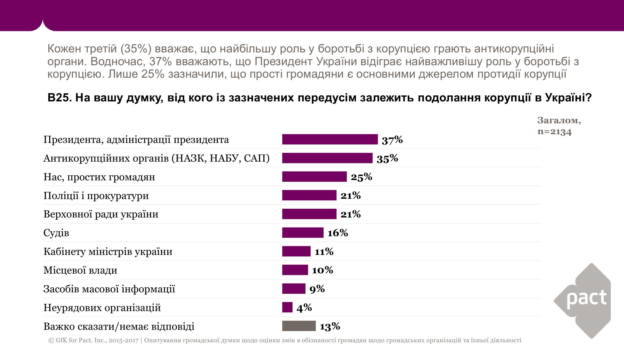Около трети украинцев (37%) считают, что преодоление коррупции в Украине прежде всего зависит от президента и его администрации, свидетельствуют данные опроса GfK Ukraine по заказу организации Pact.