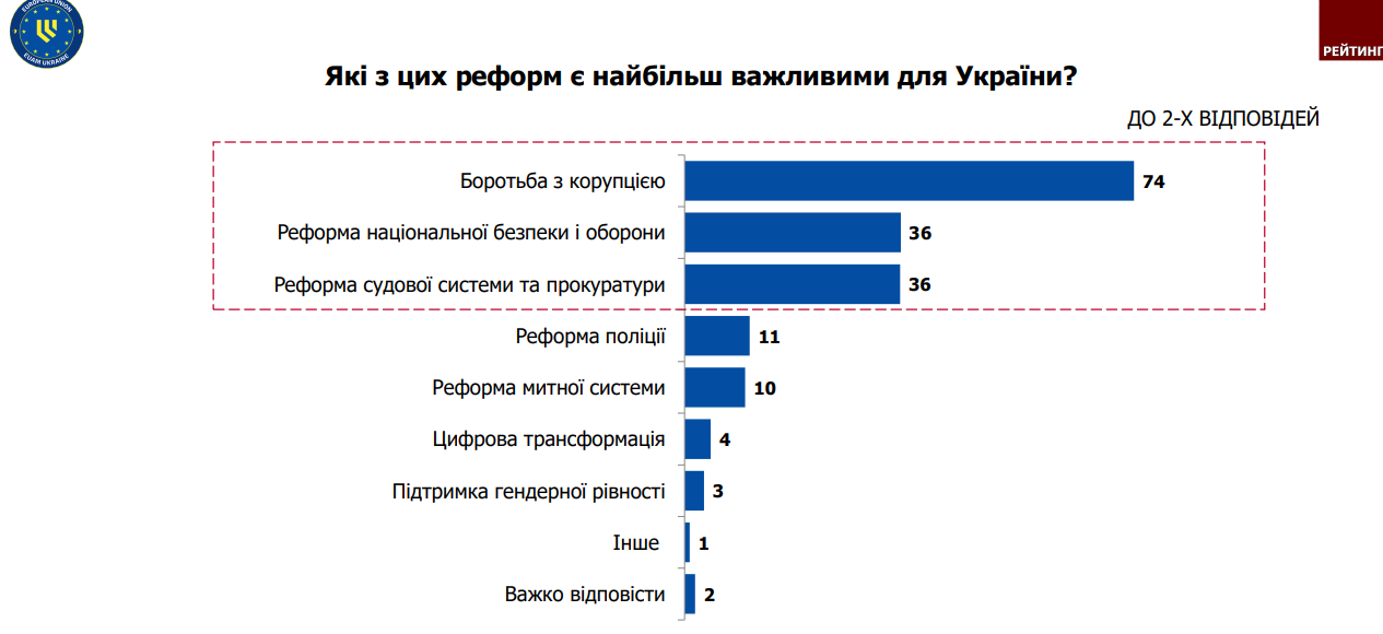 Что касается других реформ, то трансформация полиции и таможенной системы является приоритетом около 10% опрошенных, а цифровую трансформацию приоритетом назвали 4%.