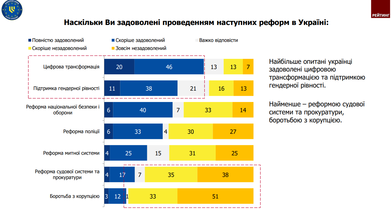 Реформы национальной безопасности и обороны, а также судебной системы и прокуратуры считают важнейшими по 36% граждан. И если 46% опрошенных удовлетворены проведением реформы национальной безопасности, то 47% ею не удовлетворены.