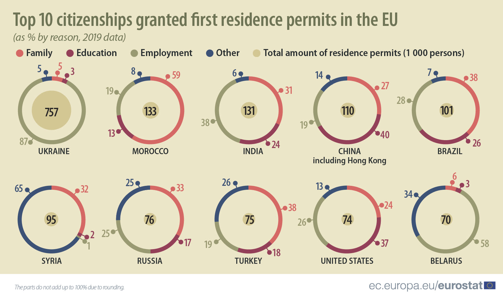 Причины, связанные с работой, составили 41% всех первых разрешений на проживание, выданных в ЕС в 2019 году, семейные обстоятельства - 27%, причины образования - 14%, в то время как другие причины, включая международную защиту, составили 18%.