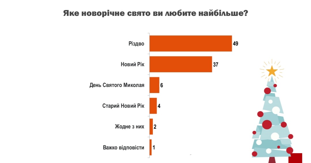 Любимым новогодним праздником для 49% украинцев является Рождество. На втором месте находится Новый год, свидетельствуют данные опроса Социологической группы "Рейтинг", проведенные 20-22 декабря 2021 года.