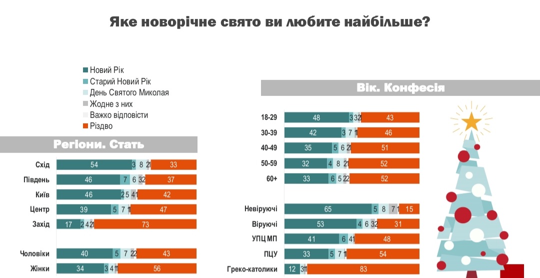 Празднование Нового года относительно любимо для жителей востока и юга. Рождество гораздо чаще выбирали на западе. В равной степени любимы эти два праздника для жителей центра и Киева.