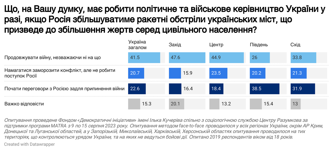 При этом 42% украинцев считают, что если агрессор усилит ракетные обстрелы украинских городов, что приведет к увеличению жертв среди гражданского населения, Украина все равно должна продолжать воевать, несмотря ни на что. Еще 21% респондентов предпочел бы попытаться заморозить конфликт, но не идти на уступки России. В то же время еще 23% опрошенных считают, что в таком случае следует начать переговоры с агрессором о прекращении войны.