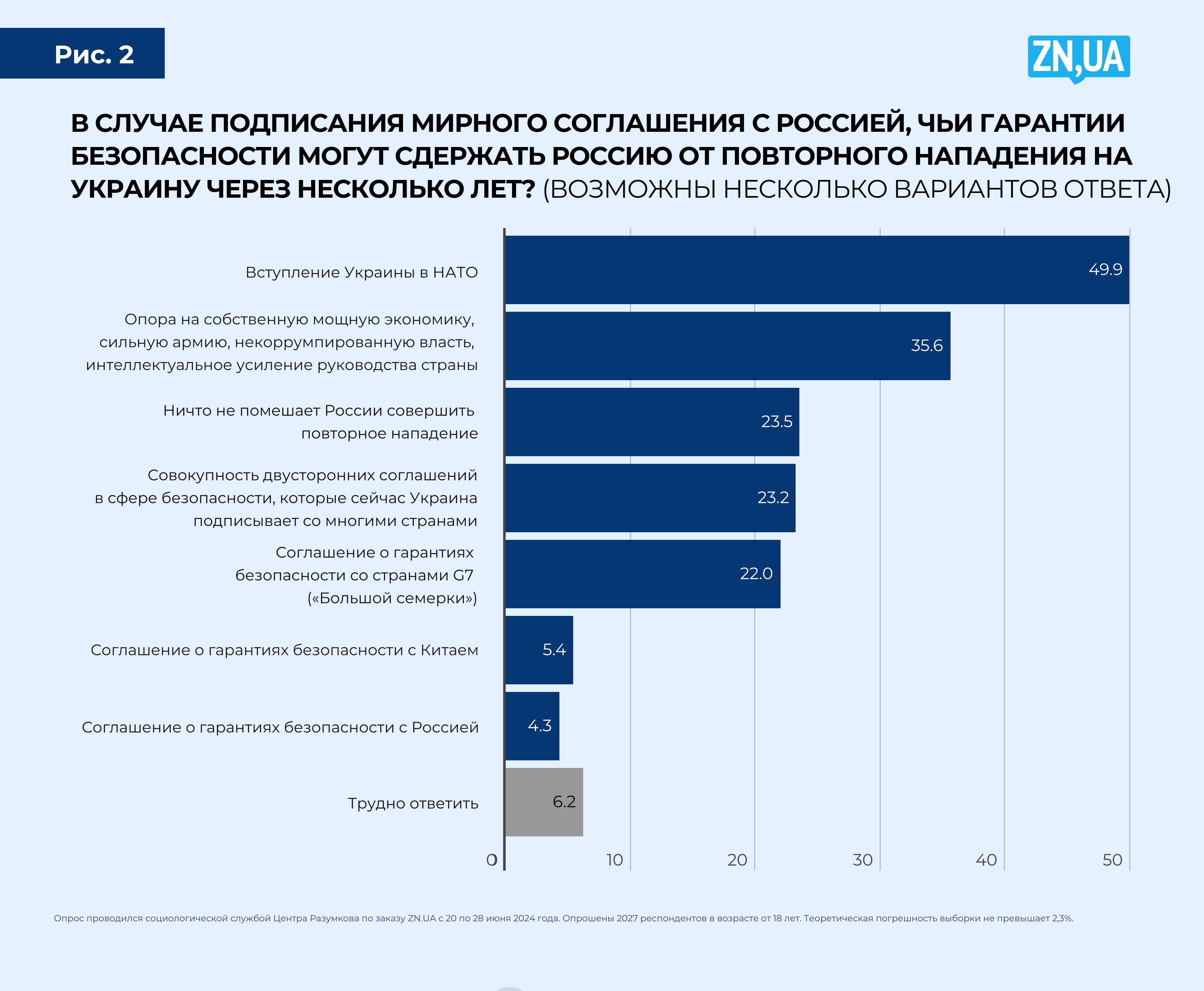 Однако каждый второй украинец считает, что только вступление в НАТО сможет удержать Россию от повторного нападения на Украину через несколько лет после подписания мирного соглашения. Меньше всего в это верят на юге Украины — 34,1% респондентов. В то же время, на востоке на Альянс полагаются 43,6%, а на западе и в центре — 54,6 и 54,1%.
