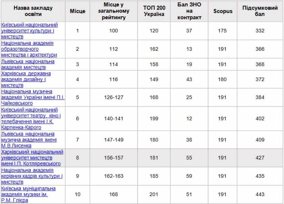 Информационный ресурс “Освіта.ua” представил вузы культуры и искусств, которые заняли высокие места в консолидированном рейтинге высших учебных заведений Украины 2021 года, передают “Українські новини”.