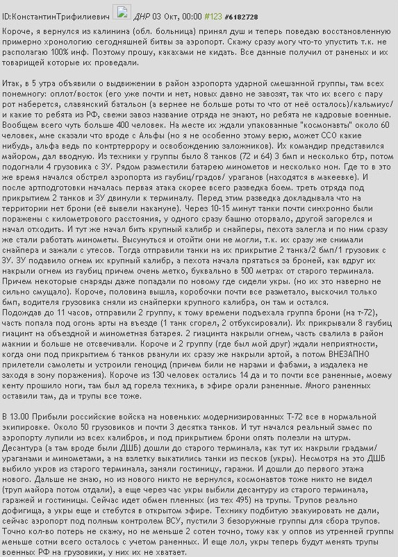 В частности, на российском форуме выложен подробный отчет о трех неудачных попытках штурма. В первом, который начался в 5 утра, принимали участие около 400 боевиков "Оплота" и "Востока", а также наемников из России. Атака была успешно отбита украинскими военными. В 11 утра также атаковали боевики. Около часа дня в атаку пошли российские десантники при поддержке трех десятков танков. Им удалось захватить старый терминал аэропорта и дойти до первого этажа нового терминала.