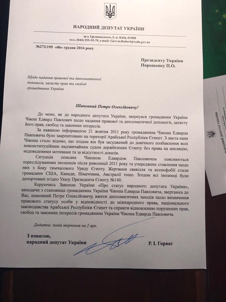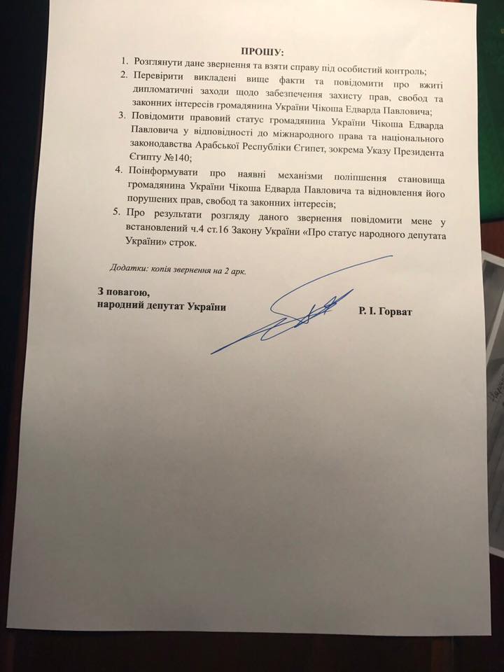 "Хорошая новость по делу Чикоша. Украинца, которого власти Египта посадили пожизненно типа за шпионаж и терроризм. Земляк Эдварда, нардеп из Закарпатья Роберт Горват (фракция "Блок Петра Порошенко") обратился к Президенту и Министру иностранных дел Украины с просьбой взять это дело под личный контроль. По словам депутата, он задал Порошенко вопрос на заседании фракции. Петр Алексеевич пообещал помочь", – написал он.