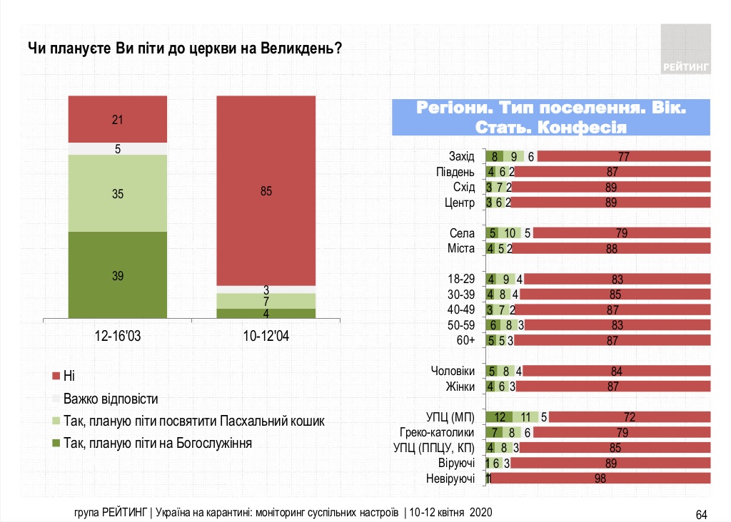 В марте на богослужение планировали идти 39% украинцев, а святить корзину – 35% граждан. Больше всего тех, кто хочет принять непосредственное личное участие в Пасхальных литургиях и посвятах куличей, среди жителей Запада, крестьян, верующих Московского патриархата и УГКЦ.