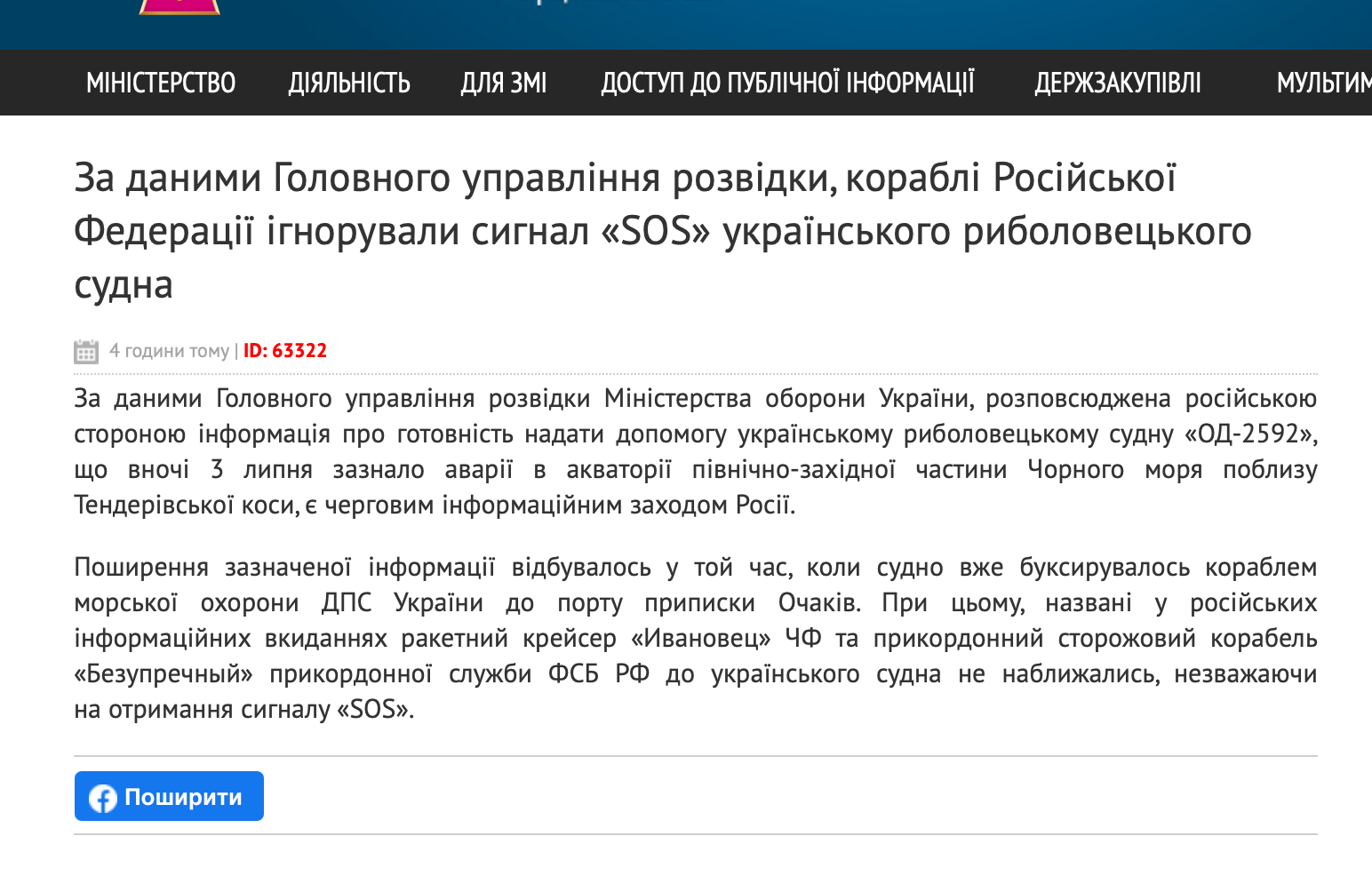 "Распространенная российской стороной информация о готовности оказать помощь украинскому рыболовном судну "ОД-2592", которое ночью 3 июля потерпело аварию в акватории северо-западной части Черного моря вблизи Тендеровской косы, является очередным информационным мероприятием России. Распространение указанной информации происходило в то время, когда судно уже буксировалось кораблем морской охраны ГПС Украины в порт приписки Очаков.При этом, названные в российских информационных вбросах ракетный крейсер "Ивановец" ЧФ и пограничный сторожевой корабль "Безупречный" пограничной службы ФСБ РФ к украинскому суду не приближались, несмотря на получение сигнала "SOS", - сообщили в Минобороны.