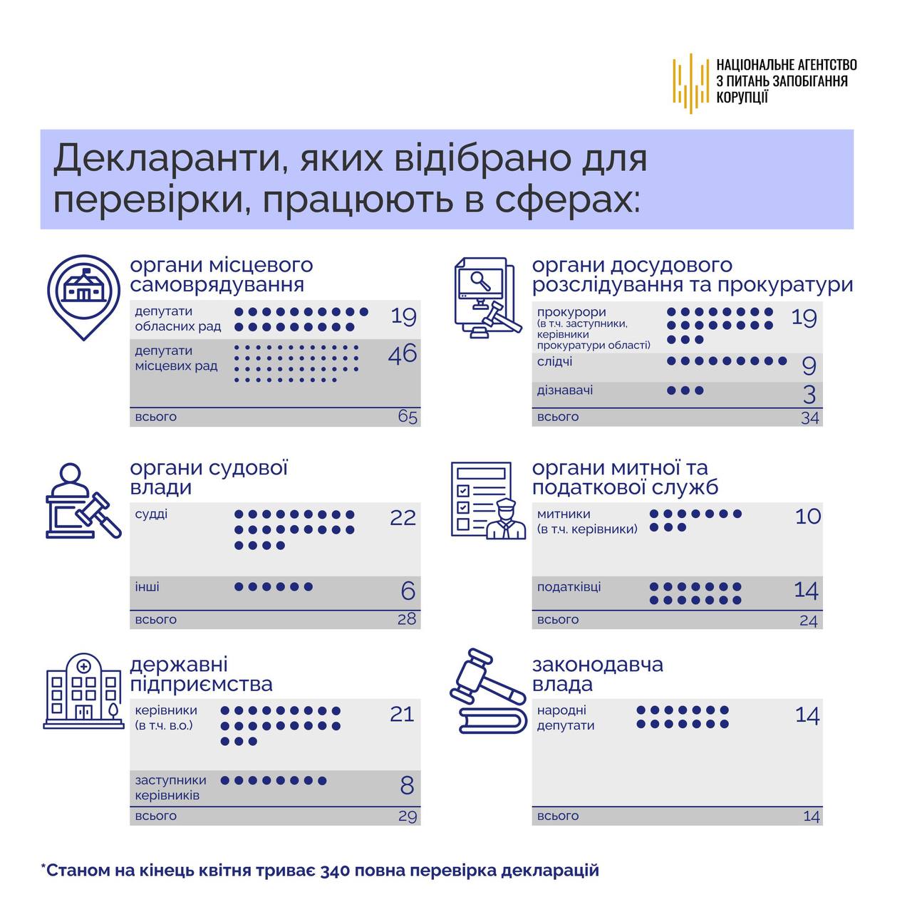“По данным НАПК, установлены признаки необоснованности активов на 1.3 млн. грн работника подразделения соцзащиты Камень-Каширской РГА Волынской области; недостоверных сведений (ст. 366-2 УК Украины) у депутата Винницкого городского совета (12,5 млн. грн), руководителя ТЦК и СП Днепропетровской области (6,2 млн. грн), депутата Дубенского городского совета Ровенской области (5,6 млн. грн), депутата Днепровского городского совета (4 млн. грн), депутата Погребищенского районного совета (3,9 млн. грн), заместителя Головы Казатинского городского совета (2,4 млн. грн)”, – сообщает агентство.